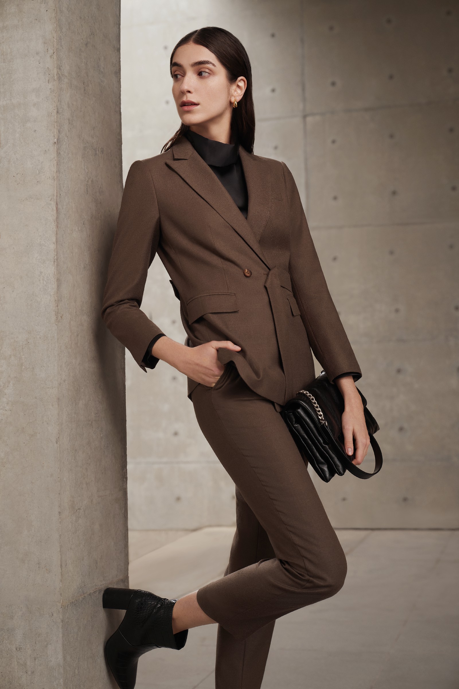 高級灰咖色,大氣戧駁領,搭配一條腰帶,職業又時尚,這款套裝搭配的是時尚款西褲,在搭配漂亮襯衫,職業風范與時尚版型相結合。面料既能保持羊毛的優點,又能發揮滌綸的長處,質地輕薄、折皺回復性好,堅牢耐磨,易洗、快干,羊毛自帶天然彈力,穿著舒適。