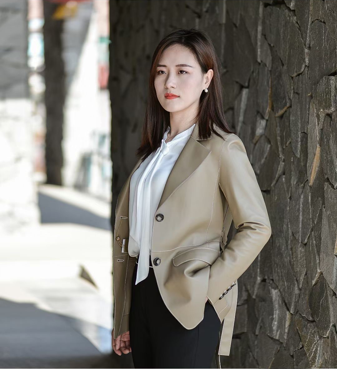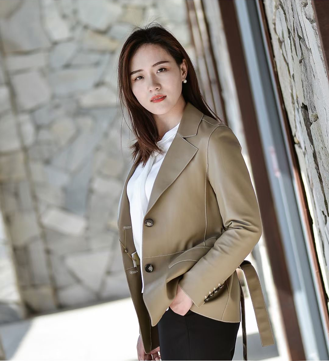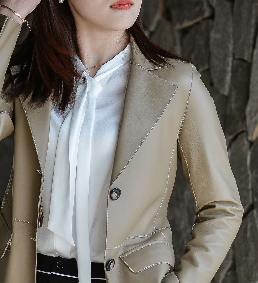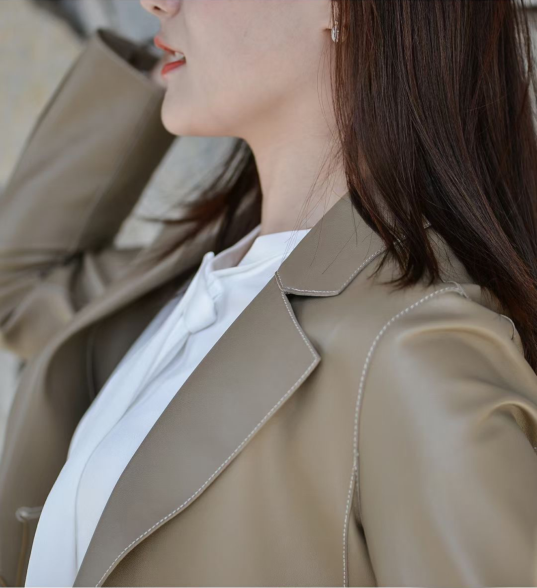 綿羊皮革中長款平駁頭西服領女士皮衣