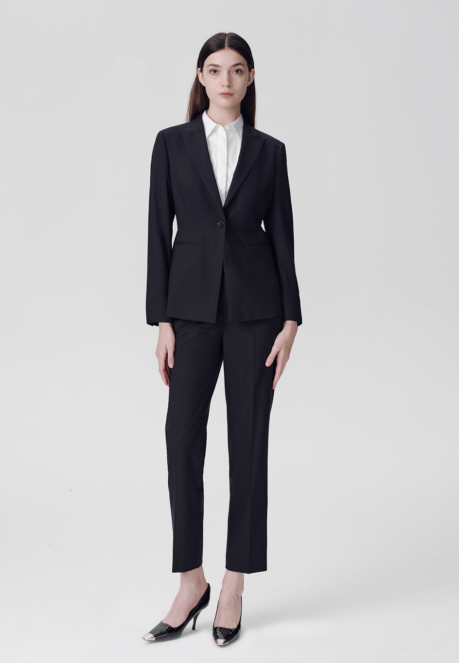 戧駁領(lǐng)西裝,一粒扣,斜下擺,雙開線口袋,三粒袖扣,后中開祺,下身搭配小直筒褲。