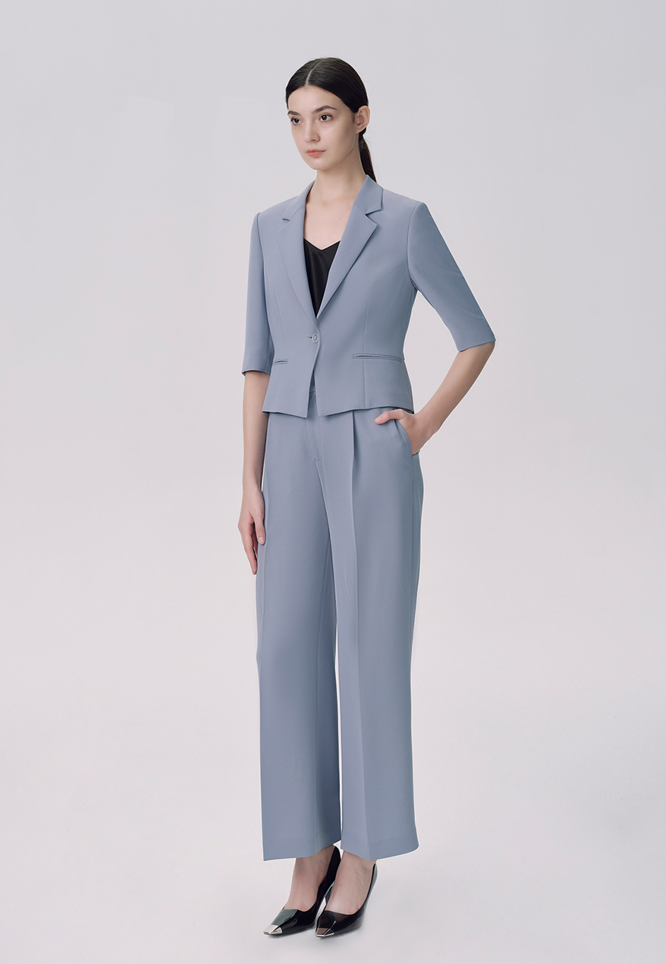 平駁領西裝,一粒扣,斜下擺,雙開線口袋,七分袖,下身搭配大筒褲。