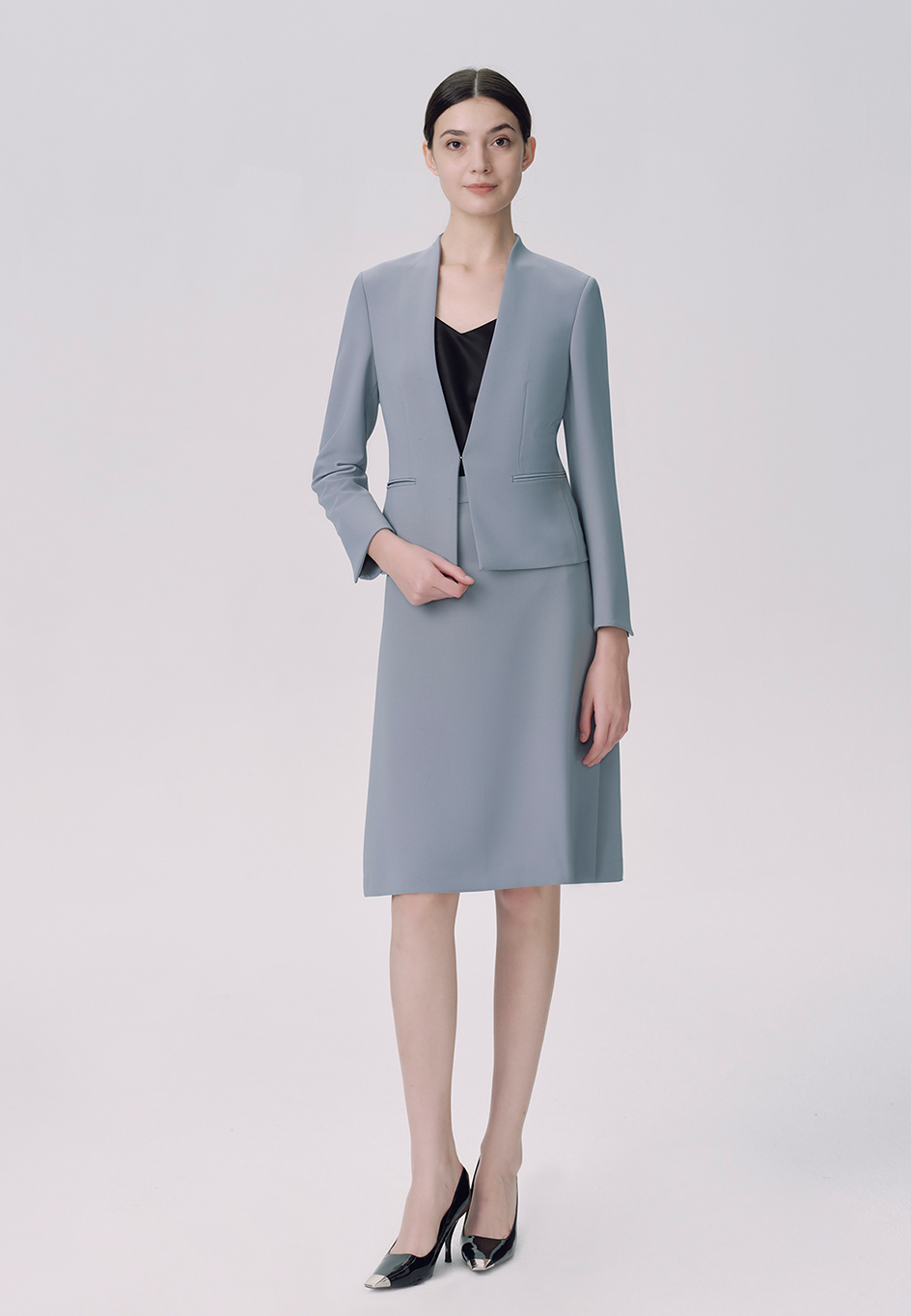 微立領(lǐng),前身釘掛鉤,直角下擺,雙開線口袋,活袖開祺可上翻袖口穿著,后中開祺,后背半里,下身搭配半裙。