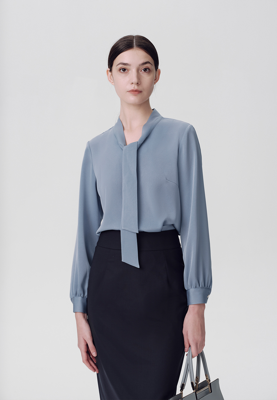 飄帶領+V領,套頭款,前片有胸省,后背有過肩,過肩下抽碎褶,寬松版型,直角袖口一粒扣,滾邊袖衩。
