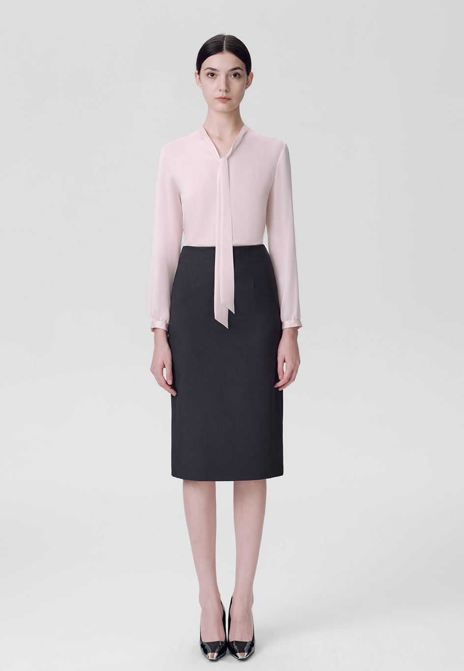 細飄帶+V領領型,套頭款式,寬松版型,直下擺,側擺開衩,前短后長,碎褶袖口,窄直角袖口一粒扣,后背有過肩。