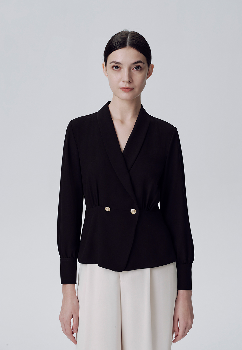 青果領,圓角下擺,雙排扣,腰部有分割線,前后腰有碎褶設計,長袖,袖口抽抽碎,寬袖口、兩粒扣,神口可上翻,合體版型。