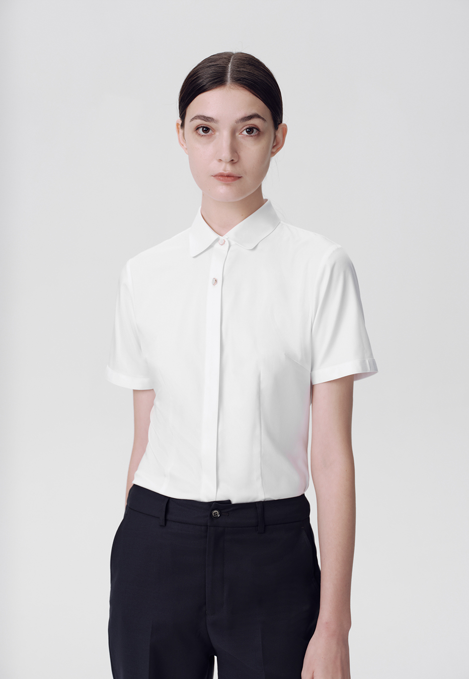 短袖襯衫,圓角領型,暗門襟加明扣裝飾,修身版型,前后收省,圓下擺。