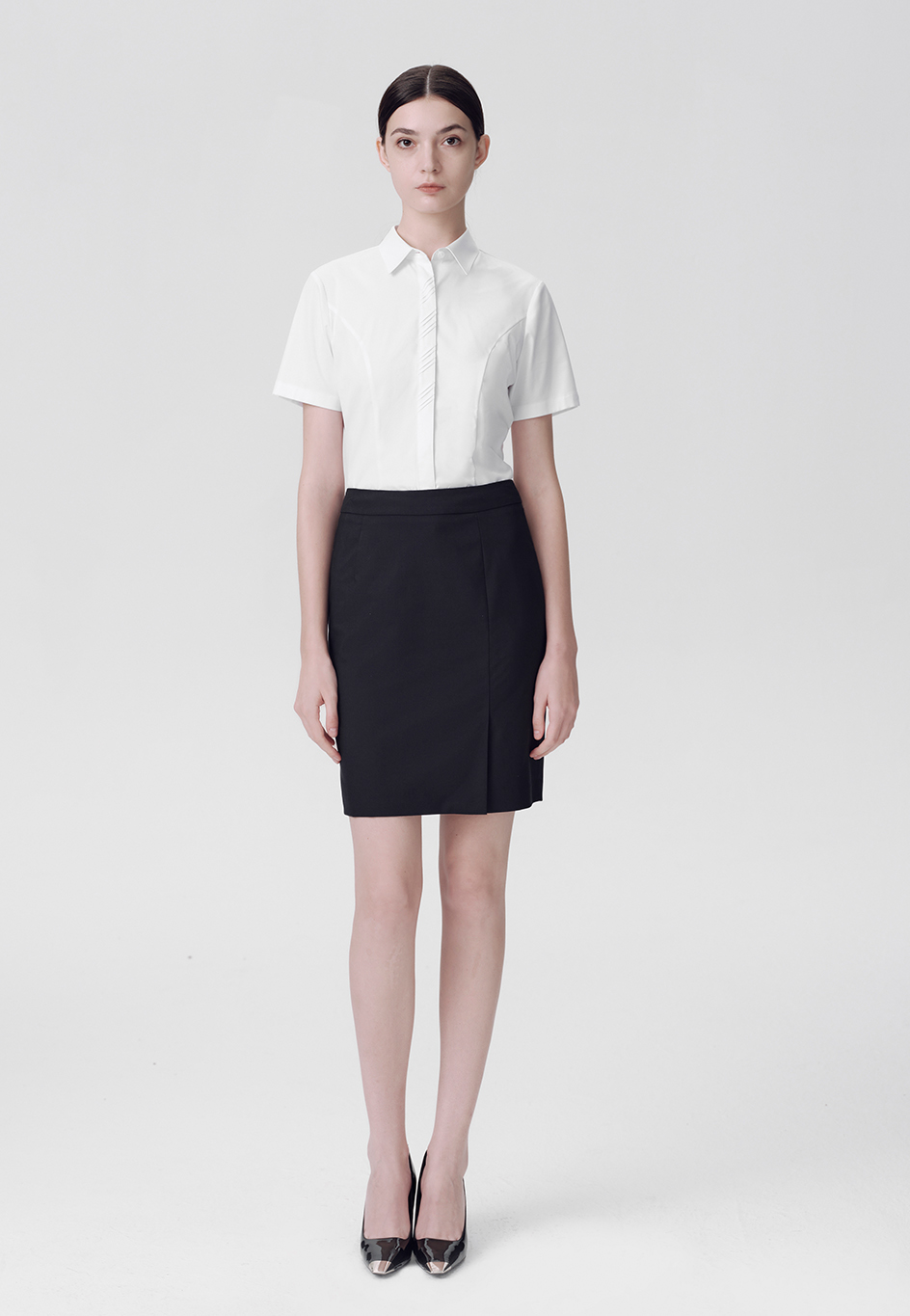 方領,暗門襟,門襟有捏褶工藝裝飾,前后彎開刀分割,修身版型,短袖,袖口有小開衩設計,圓下擺。
