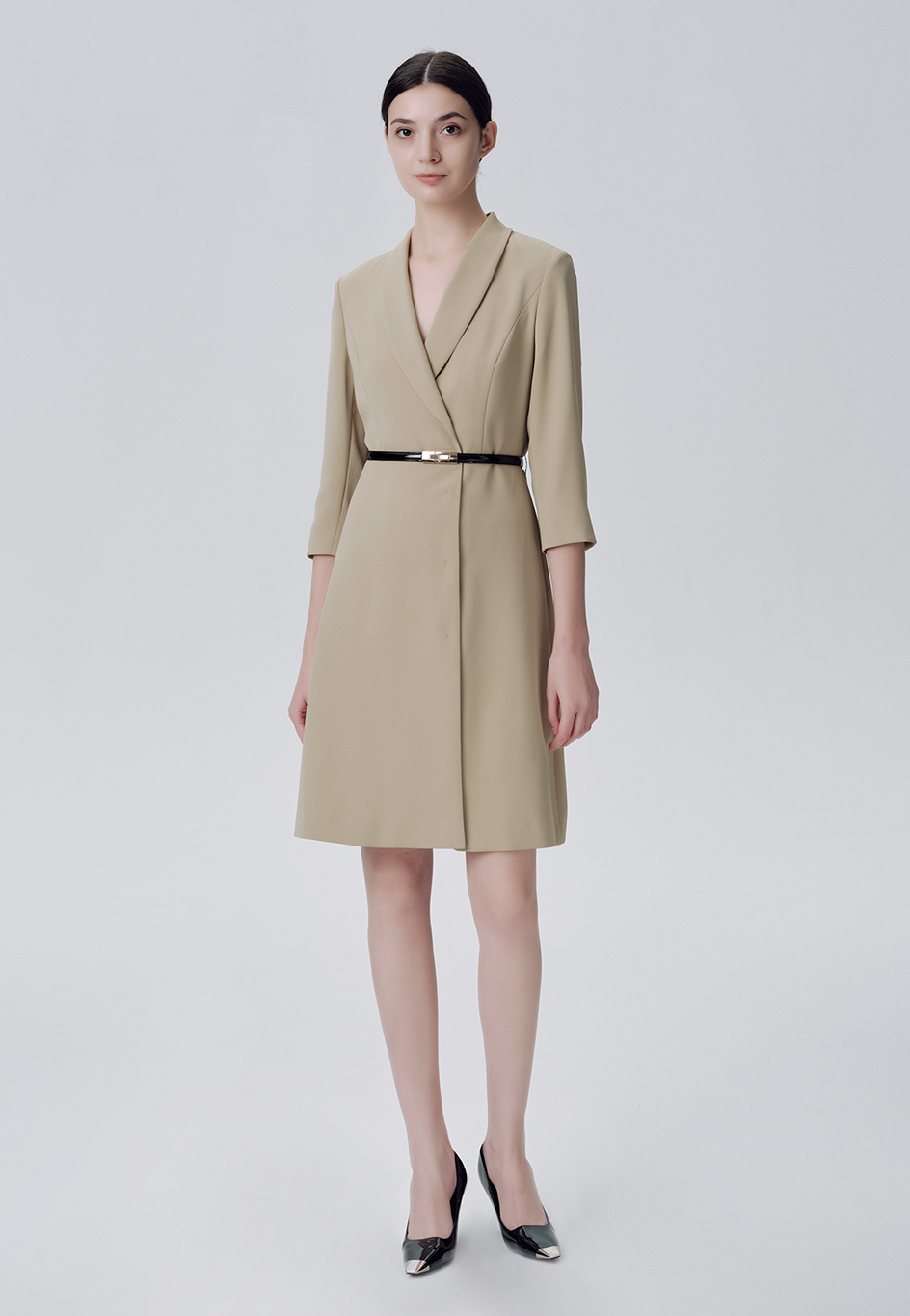 青果領連衣裙,雙排搭門內釘摁扣,內釘一粒拉扣,直角下擺,袖口開衩。
