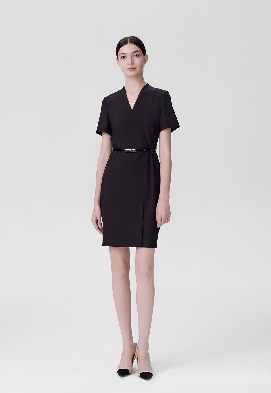 V領連衣裙,后中裝隱形拉鏈,收腰款式,袖口開衩。