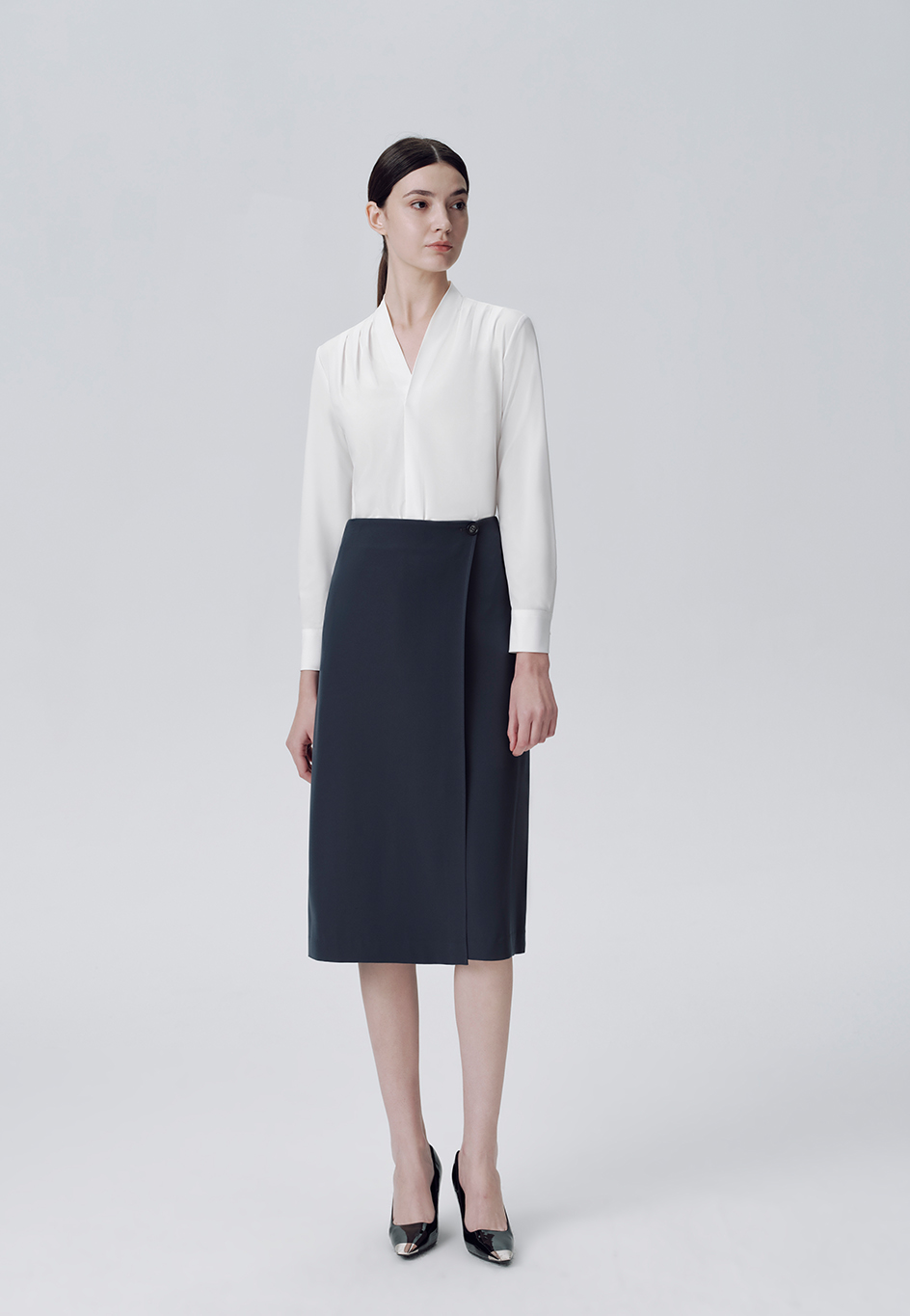 一片式筒裙,內釘一粒摁扣,外釘一粒明扣,后中分割,后省位。