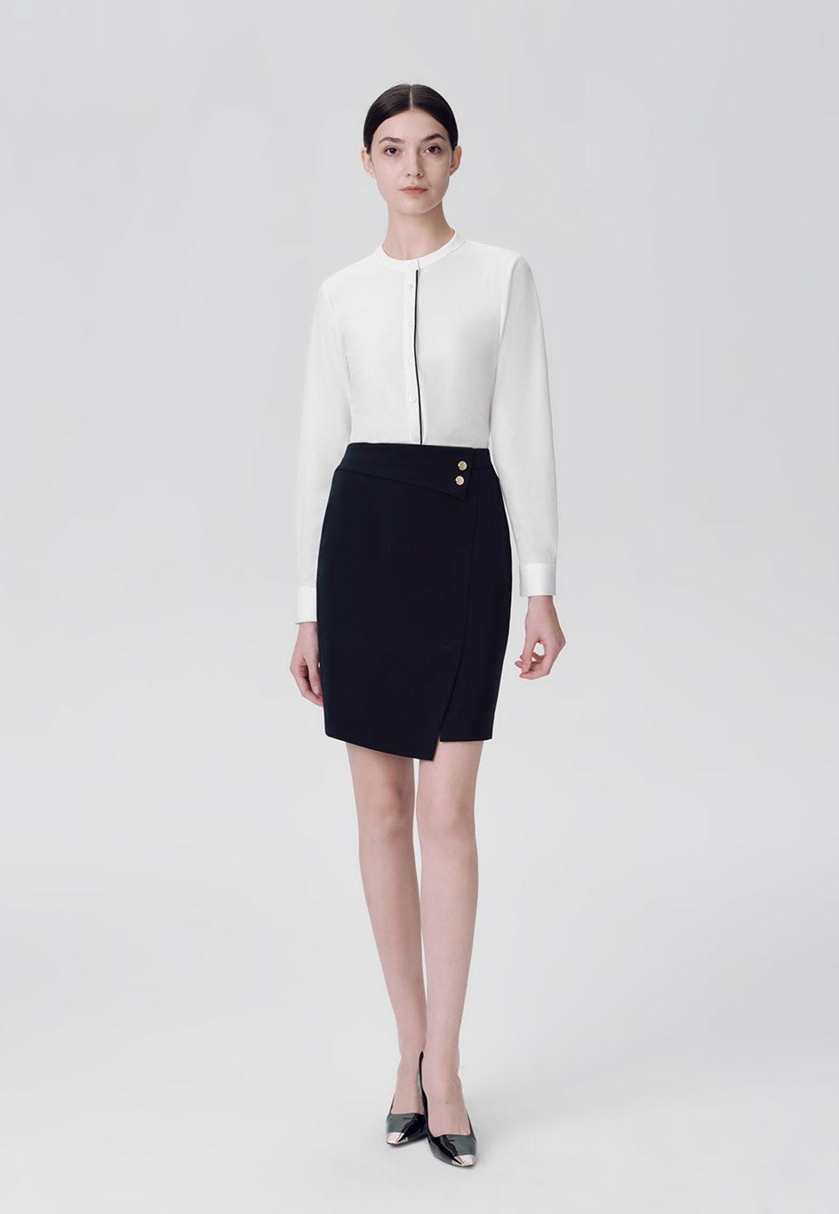 V立領,明門襟,大圓擺,半袖,直角袖口一粒扣,滾邊袖衩,袖口扭褶,前肩下及后過肩下抽碎褶,大圓擺,H版寬松版型。