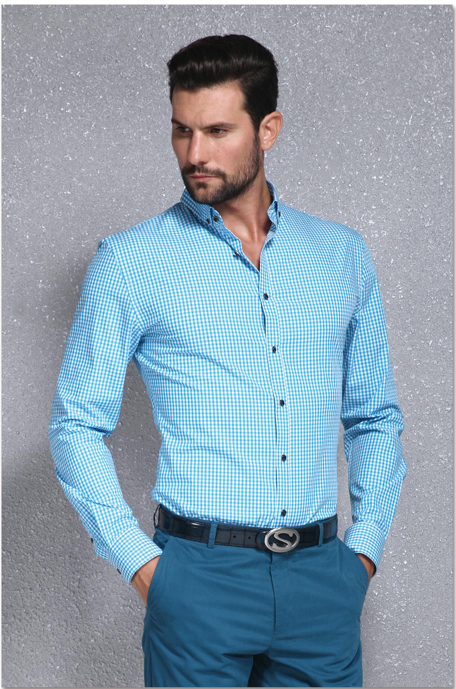 淡藍格紋男士休閑襯衫