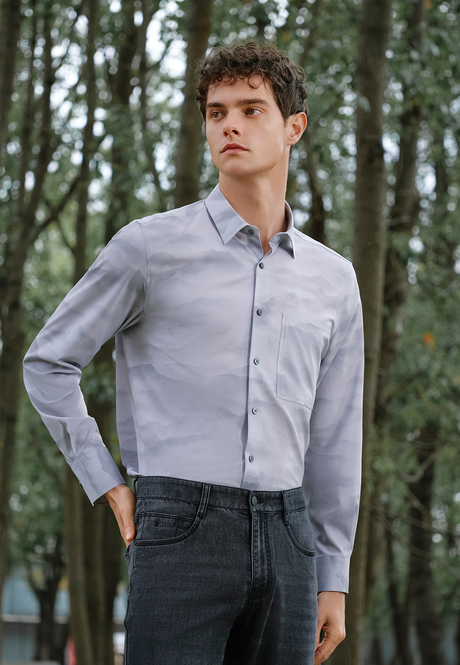 經(jīng)典版型灰印花/麻紗長(zhǎng)袖男襯衫