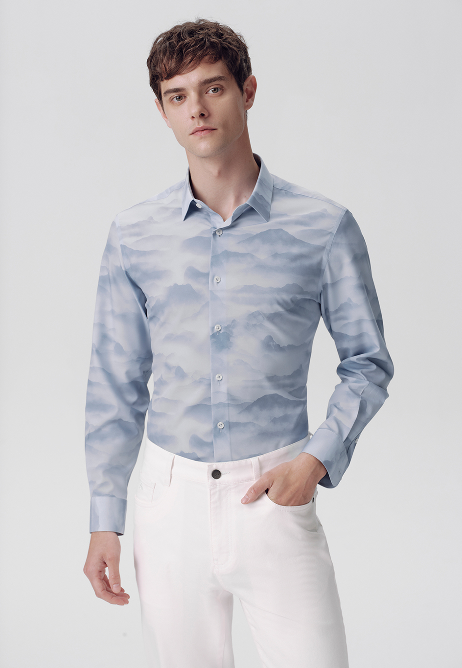 經(jīng)典版型藍(lán)印花/麻紗長袖男襯衫
