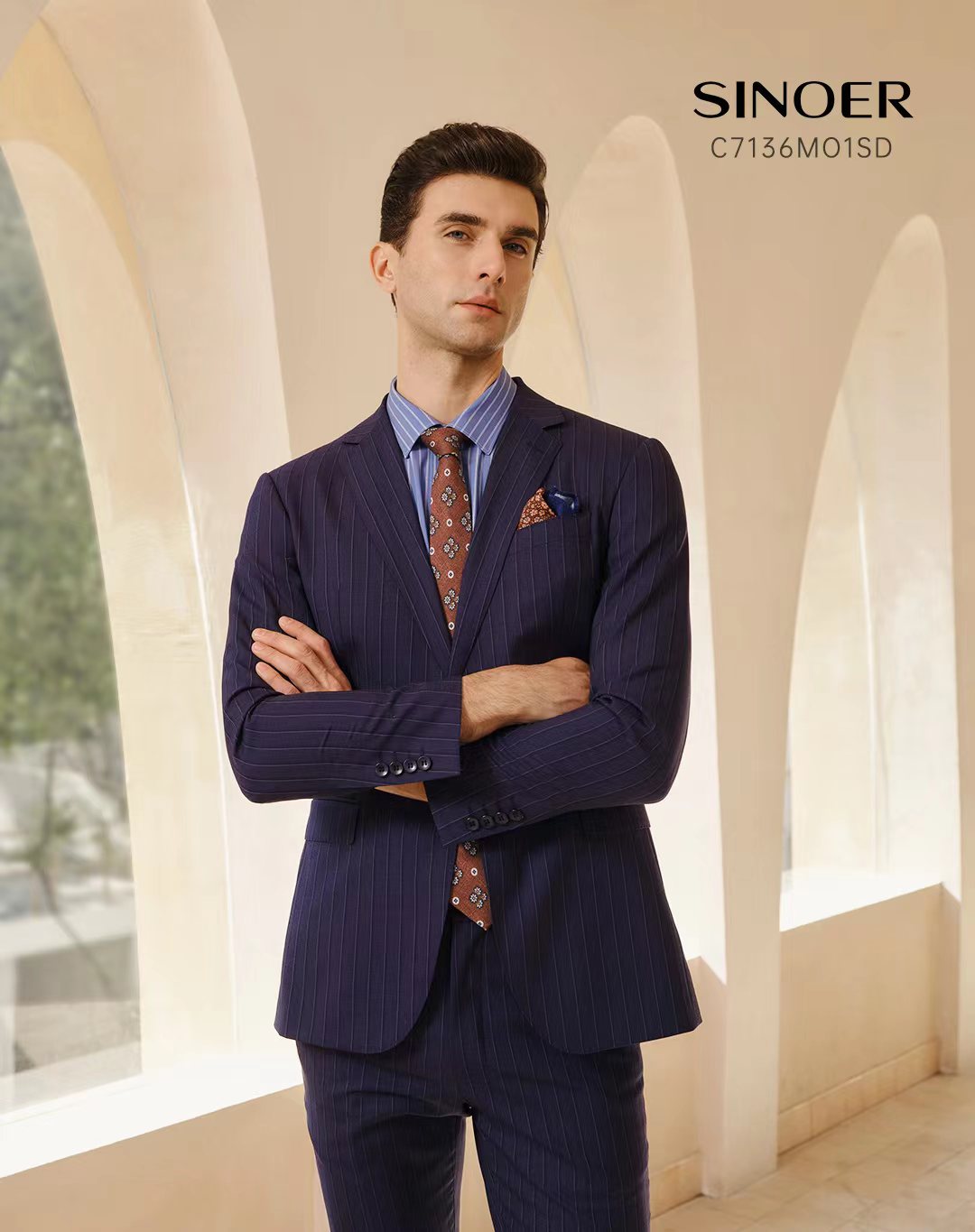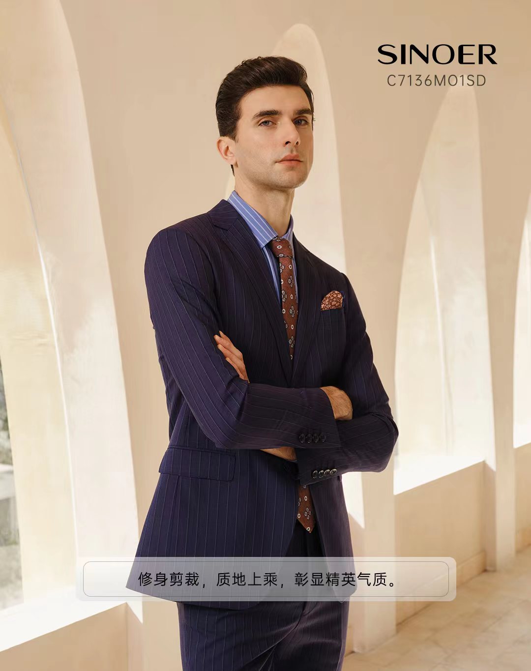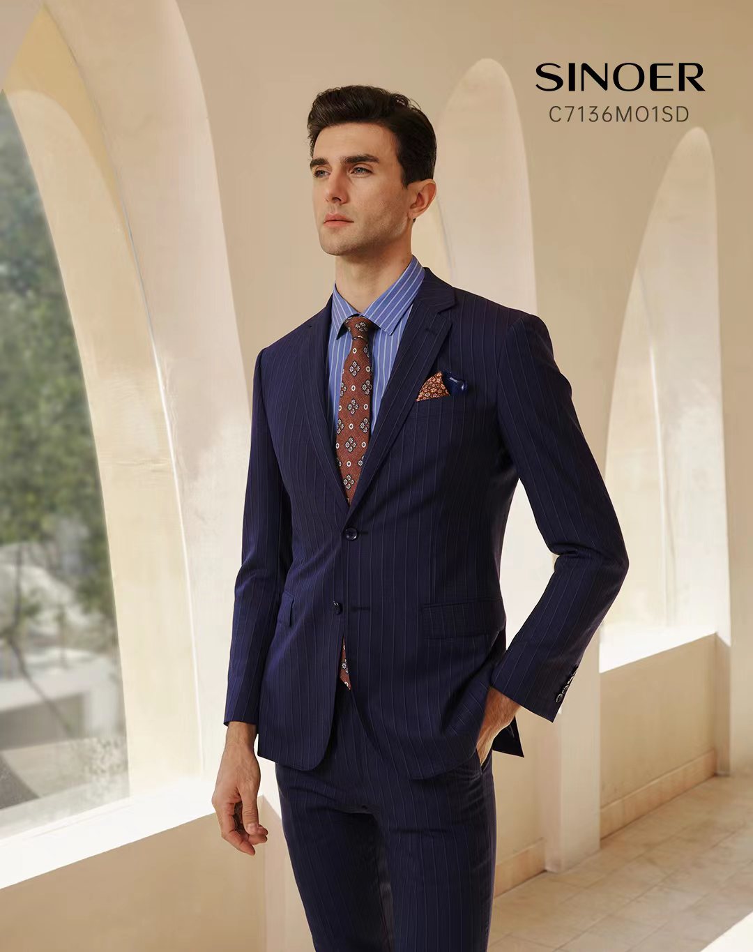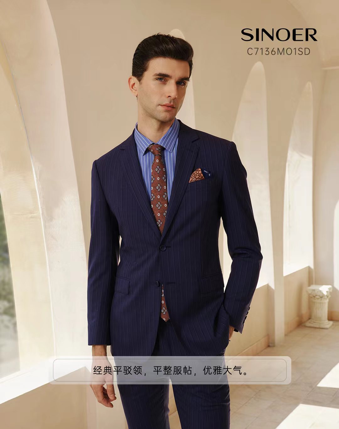 經典平駁頭,單排兩粒扣,下西服直兜設計,四粒袖扣款式,撞色里開里墊和內里珠點線,版型修身,搭配橡根滑腰/后橡根腰設計西褲。