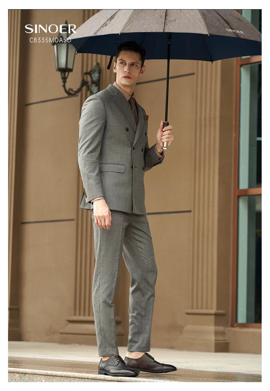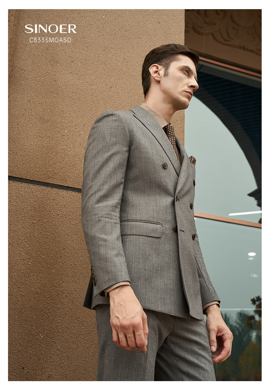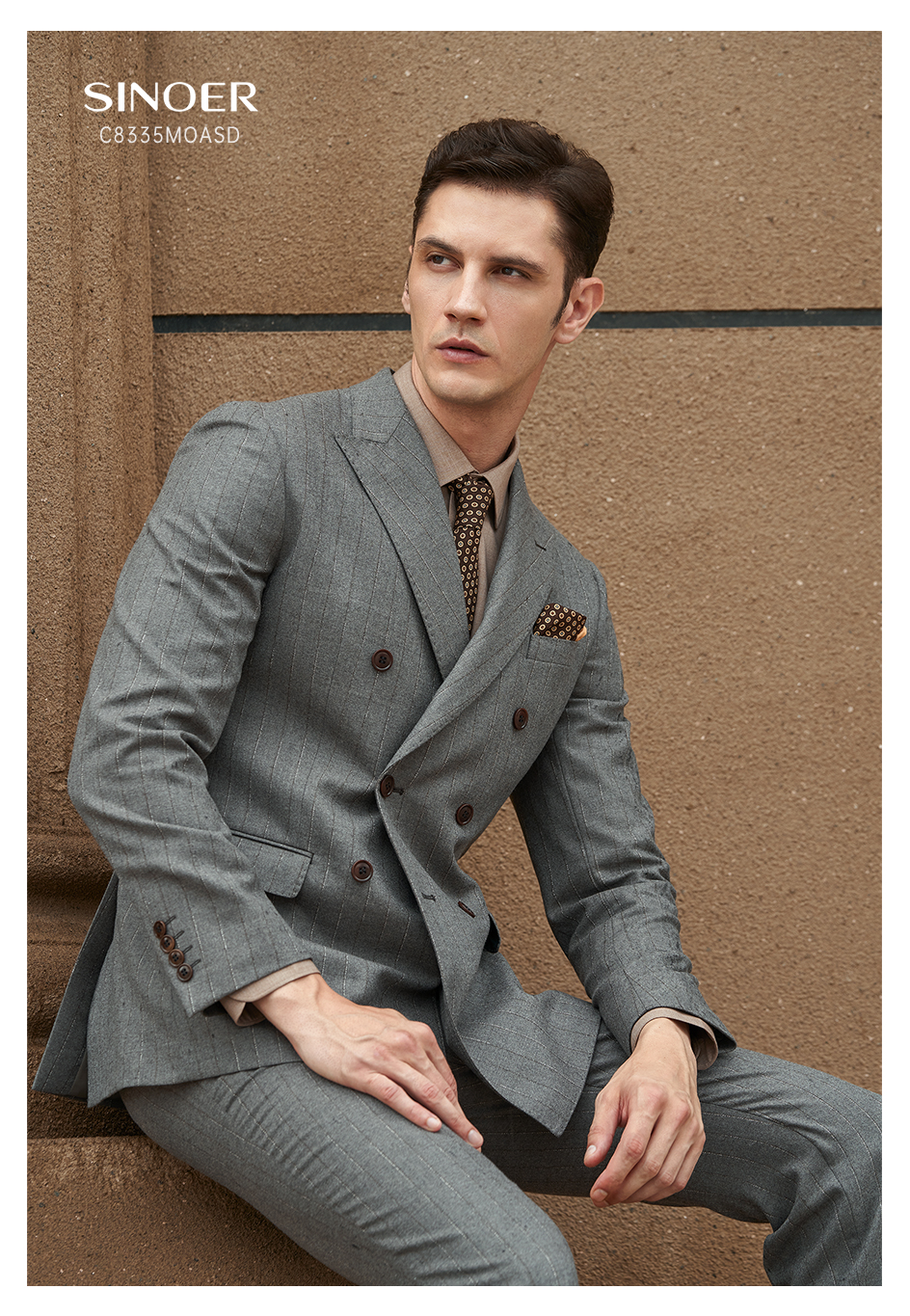 時尚戧駁頭、修身版型,雙排六粒扣、下西服直兜、四粒袖扣款式,撞色里開里墊和內里珠點線,配套西褲采用全新腰里結構設計,搭配最新彈力腰設計使穿著更加舒適。