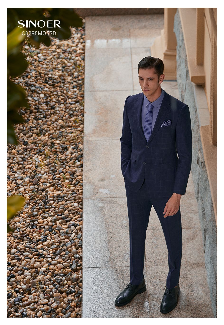 經典平駁頭、經典版型,單排兩粒扣、下西服直兜、四粒袖扣款式,內里采用彎掛面設計撞色里開里墊和內里珠點線,配套西褲采用全新腰里結構設計,搭配滑鏈滑腰設計使穿著更加舒適。