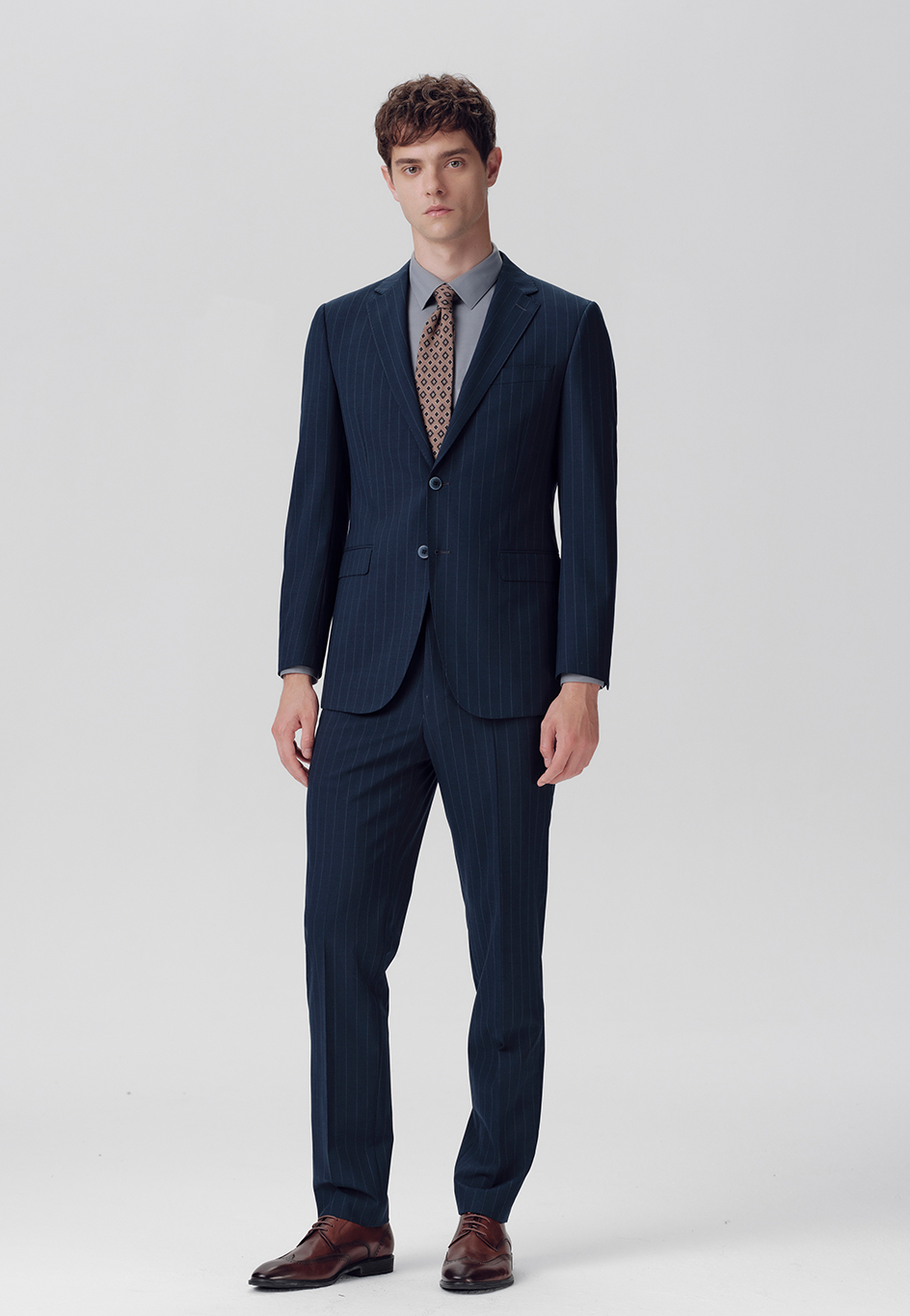 精致嚴(yán)謹(jǐn)?shù)呢Q條紋,在視覺上可以起到拉伸修飾身形效果,配合低調(diào)沉穩(wěn)的藏藍(lán)色,打破沉悶感,營(yíng)造精致優(yōu)雅氛圍。大氣平駁領(lǐng),單排二粒扣,下西服口袋、四粒袖扣款式,展現(xiàn)十足氣場(chǎng)輕松應(yīng)對(duì)各種場(chǎng)合。撞色里開里墊和內(nèi)里珠點(diǎn)線,簡(jiǎn)約經(jīng)典不張揚(yáng),配套西褲采用搭配橡根滑腰設(shè)計(jì)使穿著更加舒適。