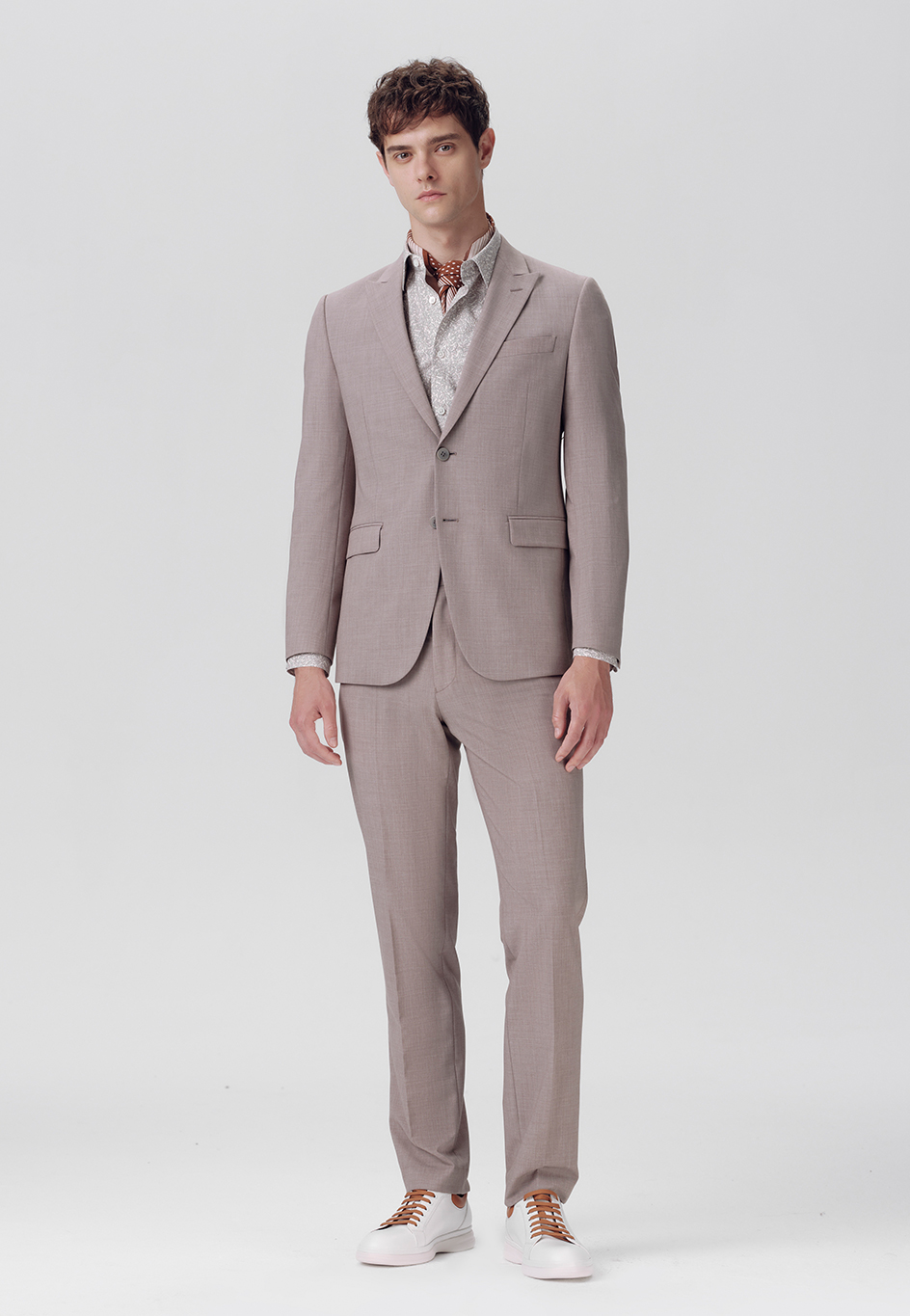 自帶復(fù)古溫柔氣質(zhì)的卡其色西服套裝。利落的剪裁突顯干練,柔軟的面料舒適貼身,輕松營造精致優(yōu)雅的紳士風(fēng)度。單排二??鄞钆湔瓚犟g領(lǐng),更顯年輕隨性,西服口袋,經(jīng)典百搭,三粒袖扣,周身無明線珠點設(shè)計,讓整體造型更加簡約利落,配套的西裝褲與外套組合,兼具了休閑和商務(wù)性。