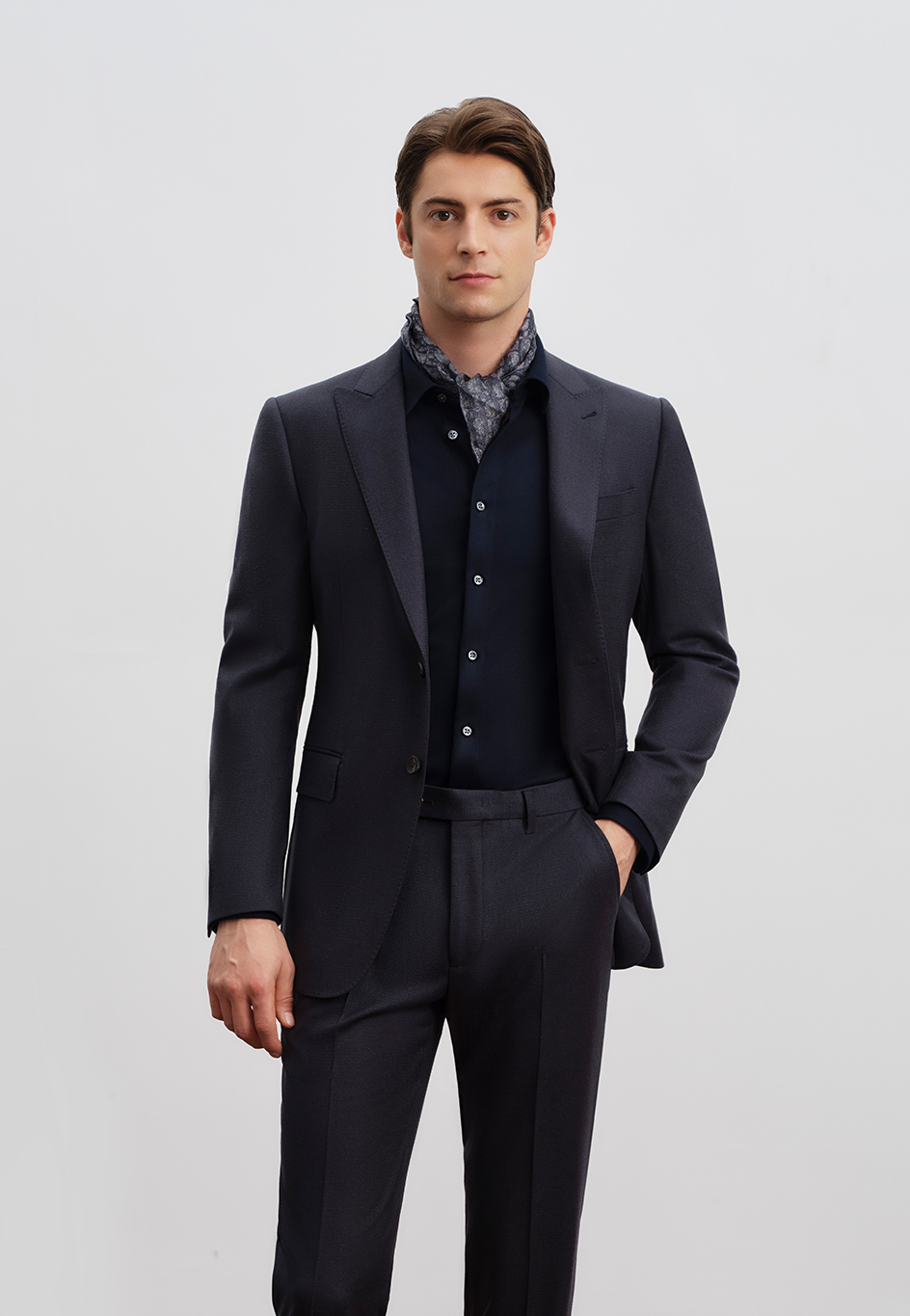 利落戧駁領(lǐng)+單排二粒扣款式,輕松穿出瀟灑干練氣質(zhì),西服口袋、四粒袖扣款式,給你由內(nèi)而外的精致與高級,配套西褲采用橡根滑腰設(shè)計,腰部松緊無束縛,褲型線條流暢利落簡約。