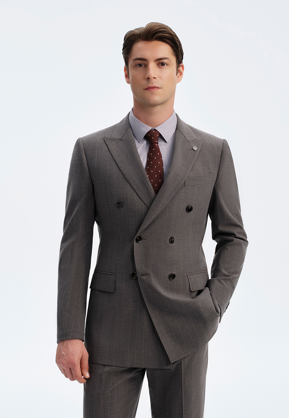 咖色條紋雙排扣西裝,呈現(xiàn)紳士干練的氣質(zhì),彰顯西裝的筋骨感和層次感。銳利且有攻擊性的戧駁領(lǐng)搭配雙排六粒扣,鋒利氣場(chǎng)全開(kāi),雙排扣的腰線更為收斂,線條更具力量,將男性的性感張力與紳士?jī)?yōu)雅展現(xiàn)的淋漓盡致。配套西褲采用全新腰里結(jié)構(gòu)設(shè)計(jì),搭配橡根滑腰設(shè)計(jì)使穿著更加舒適。