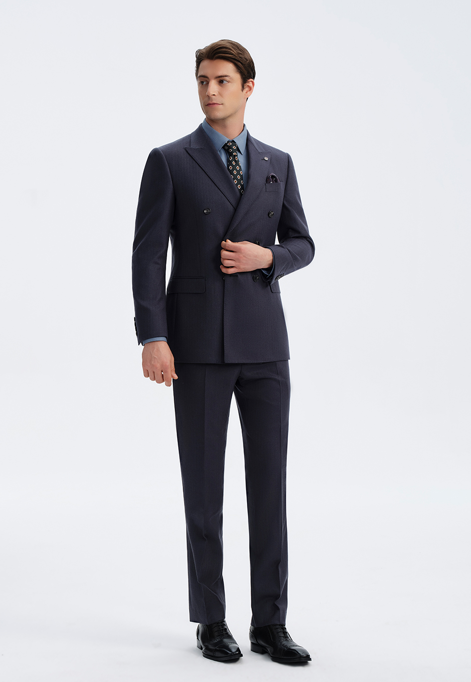灰藍色人字紋雙排扣西裝,呈現紳士干練的氣質,彰顯西裝的筋骨感和層次感。銳利且有攻擊性的戧駁領搭配雙排六粒扣,鋒利氣場全開,雙排扣的腰線更為收斂,線條更具力量,將男性的性感張力與紳士優雅展現的淋漓盡致。配套西褲采用全新腰里結構設計,搭配橡根滑腰設計使穿著更加舒適。