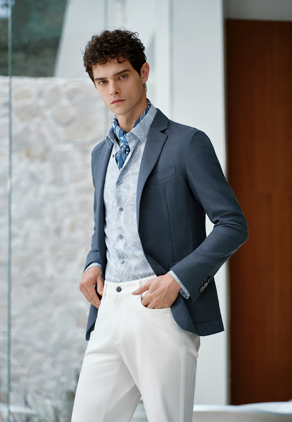 仿麻感面料的西服,面料層次豐富,既有亞麻的松弛感,也有羊毛的抗皺性真絲的光澤,爽滑抗皺,無墊肩、無里村真正做到無束縛依然精致, 輕松保持紳士體面,優雅十足的蝶貝紐扣,天然又精致。平駁領搭配明貼兜設計,松弛隨性,簡約大方的設計與輕盈靈動的天然材料相得益彰,輕松打造休閑與優雅兼備的精品