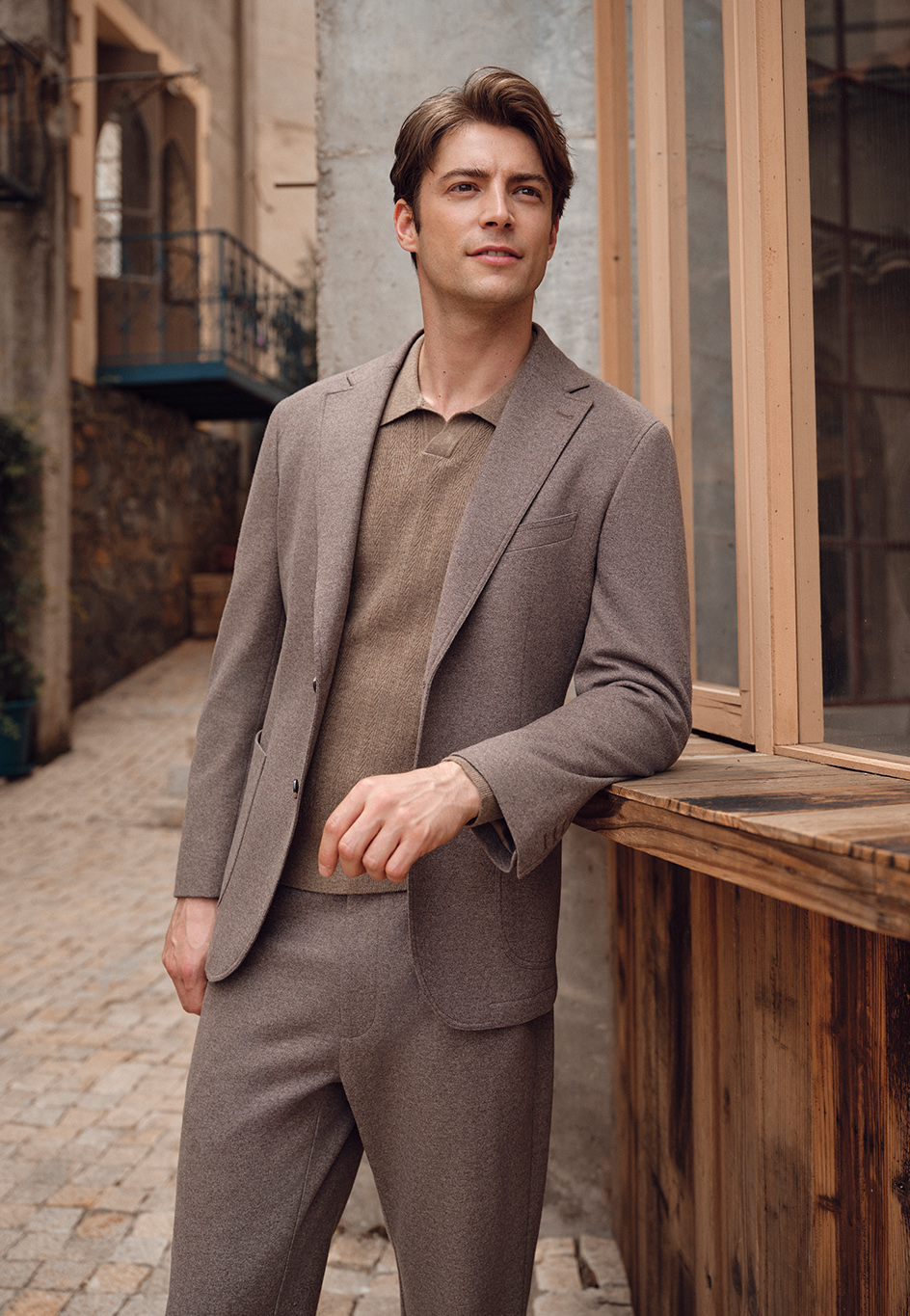 這款西裝采用平駁頭、單排兩粒扣設計,搭配上手巾兜與下貼兜,整體線條利落。周身以雙明線勾勒,簡約而不失細節;無胸襯、無墊肩的設計,更顯輕盈隨性,貼合身形。內里采用半里襯工藝,配合擼沿條設計,提升穿著舒適度與自由度。袖口裝飾四粒袖扣,平行鎖眼,于低調中彰顯精致質感。