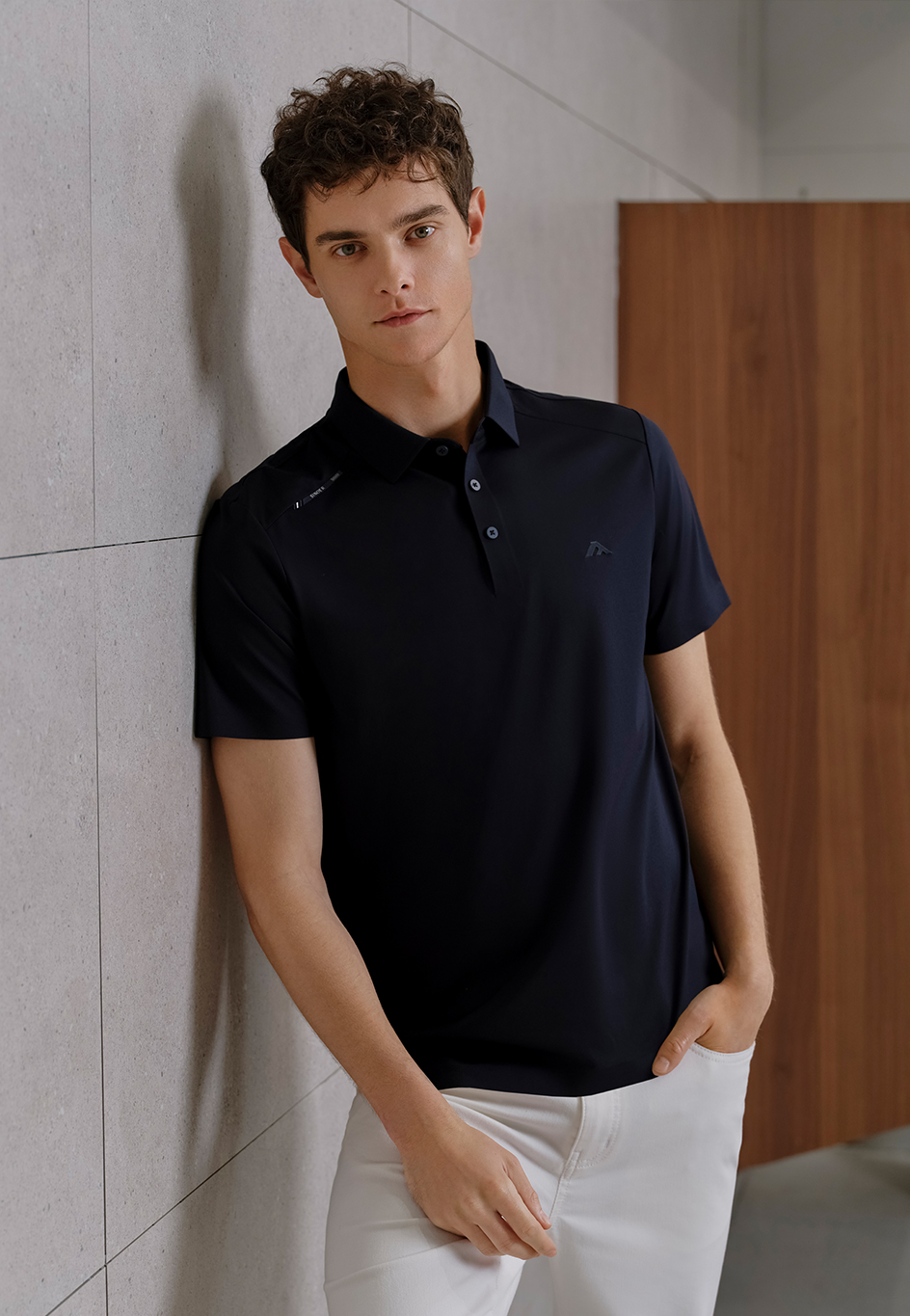 這款Polo衫,采用經典的翻領設計,領型挺括有型,能夠很好地修飾頸部線條,使穿著者顯得精神干練。領口的寬度適中,既不會過于緊繃,也不會過于寬松,保證了穿著的舒適度和美觀度。領口處的紐扣設計簡潔大方,三顆紐扣均勻排列,可根據個人喜好選擇不同的開合程度,增添穿著的靈活性和時尚感。肩部采用獨特的拼接設計,在肩部位置添加了一條帶有紋理的裝飾條,從領口延伸至肩部外側,不僅增強了肩部的立體感,還為整體造型增添了一份時尚元素,使這款Polo衫在簡約中透出一絲個性與活力,打破了純色服裝的單調感。