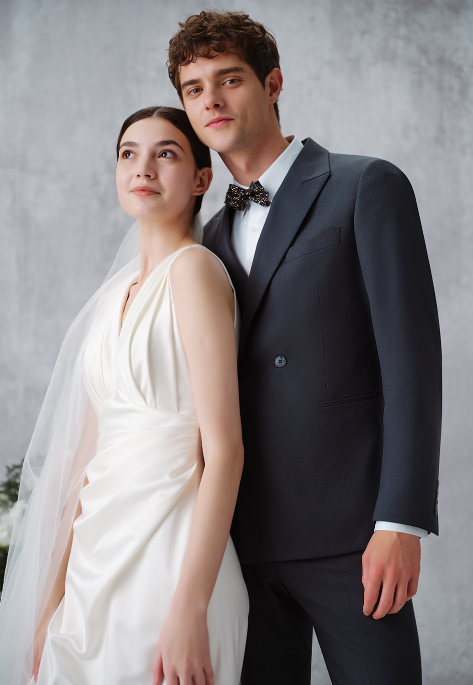 柔情似水、佳期如夢,精致的提花線條隱現點點星光,在筆挺的西裝上歡呼雀躍。羊毛混紡彈力面料,攜著銅氨纖維柔軟與舒張并存的力量,裹帶著山水一程、三生有幸的信念,與摯愛一起奔赴人生最重要的歷程。